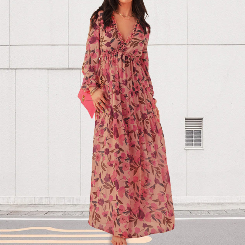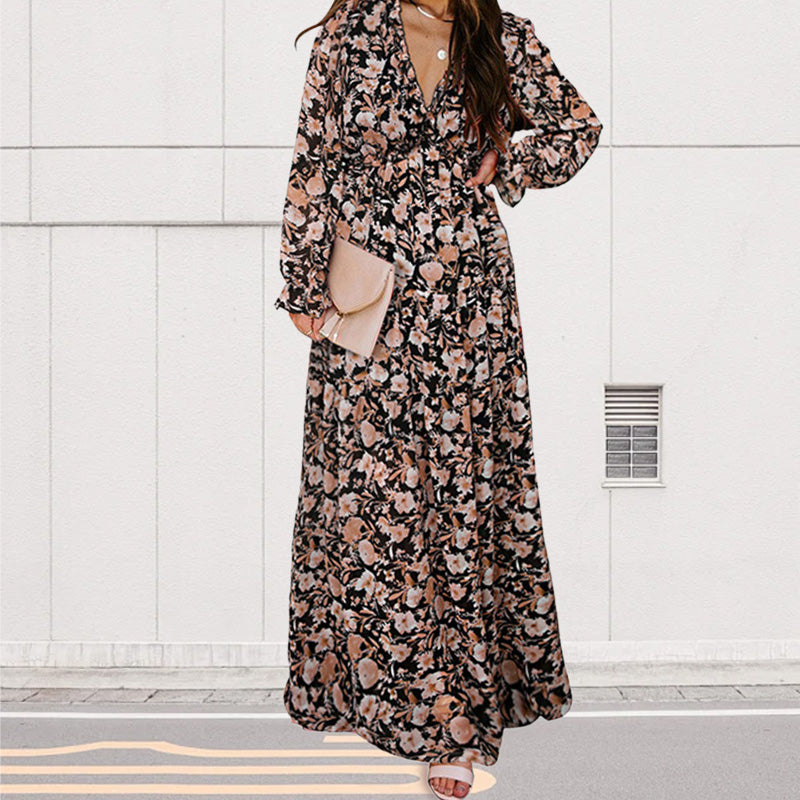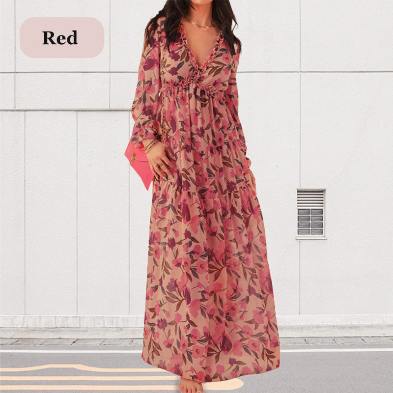 1 * Women's Floral V-Neck Long Sleeve Flowy Dress