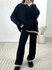 This two-piece ensemble features a rib-knit sweater and matching high-waisted pants, both adorned with stylish stripe detailing at the hems.