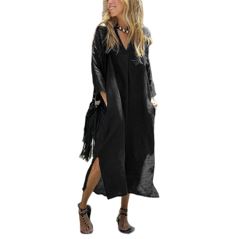 Women's Casual V-Neck Long Dress with Pockets & Slit Hem